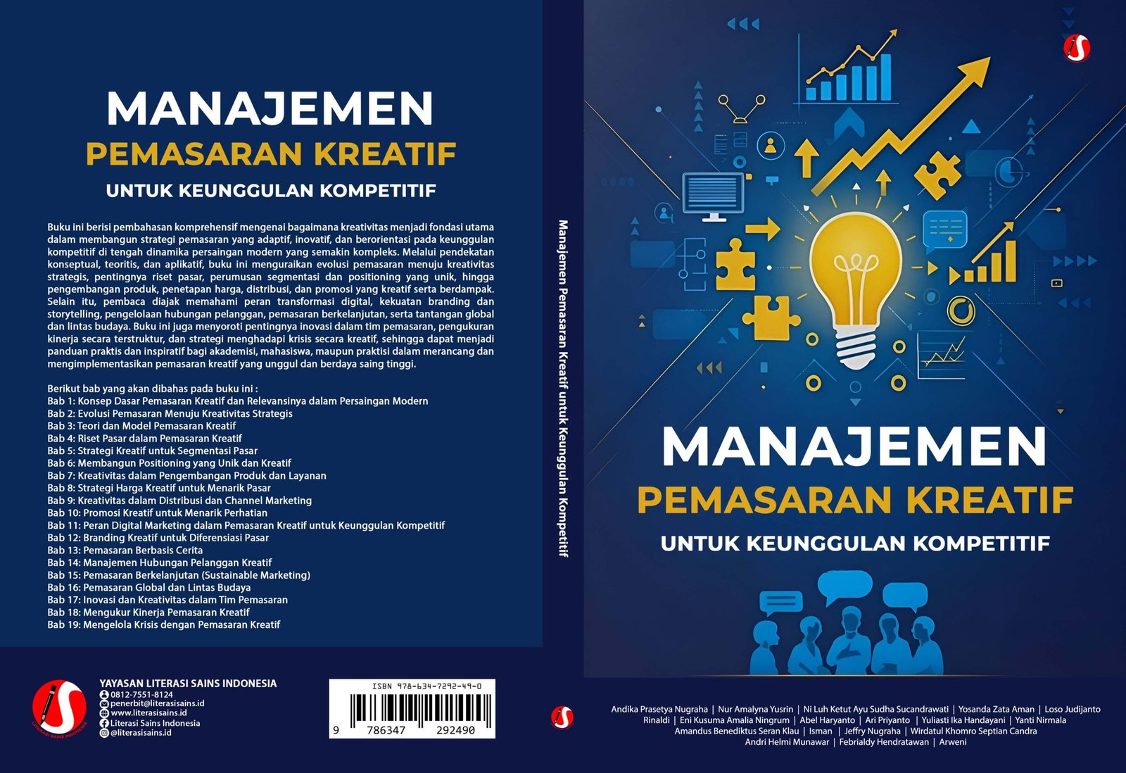 Buku ini berisi pembahasan komprehensif mengenai bagaimana kreativitas menjadi fondasi utama dalam membangun strategi pemasaran yang adaptif, inovatif, dan berorientasi pada keunggulan kompetitif di tengah dinamika persaingan modern yang semakin kompleks. Melalui pendekatan konseptual, teoritis, dan aplikatif, buku ini menguraikan evolusi pemasaran menuju kreativitas strategis, pentingnya riset pasar, perumusan segmentasi dan positioning yang unik, hingga pengembangan produk, penetapan harga, distribusi, dan promosi yang kreatif serta berdampak. Selain itu, pembaca diajak memahami peran transformasi digital, kekuatan branding dan storytelling, pengelolaan hubungan pelanggan, pemasaran berkelanjutan, serta tantangan global dan lintas budaya. Buku ini juga menyoroti pentingnya inovasi dalam tim pemasaran, pengukuran kinerja secara terstruktur, dan strategi menghadapi krisis secara kreatif, sehingga dapat menjadi panduan praktis dan inspiratif bagi akademisi, mahasiswa, maupun praktisi dalam merancang dan mengimplementasikan pemasaran kreatif yang unggul dan berdaya saing tinggi.