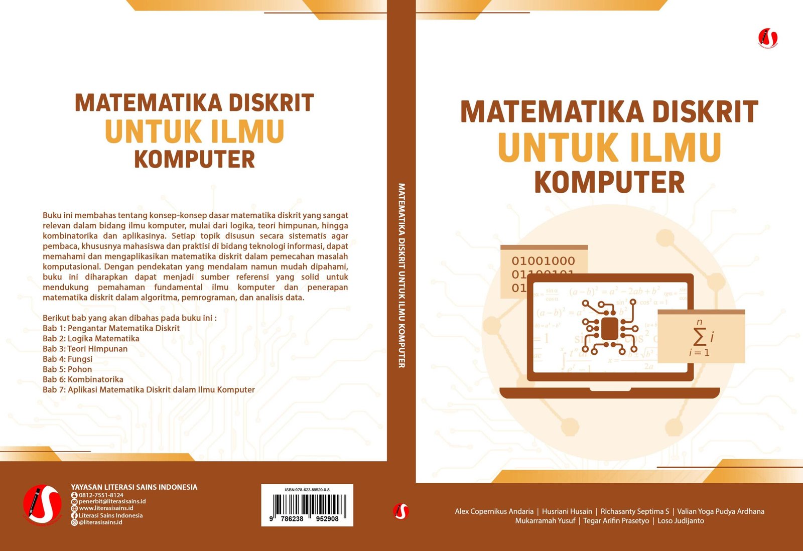 Buku ini membahas tentang konsep-konsep dasar matematika diskrit yang sangat relevan dalam bidang ilmu komputer, mulai dari logika, teori himpunan, hingga kombinatorika dan aplikasinya. Setiap topik disusun secara sistematis agar pembaca, khususnya mahasiswa dan praktisi di bidang teknologi informasi, dapat memahami dan mengaplikasikan matematika diskrit dalam pemecahan masalah komputasional. Dengan pendekatan yang mendalam namun mudah dipahami, buku ini diharapkan dapat menjadi sumber referensi yang solid untuk mendukung pemahaman fundamental ilmu komputer dan penerapan matematika diskrit dalam algoritma, pemrograman, dan analisis data.